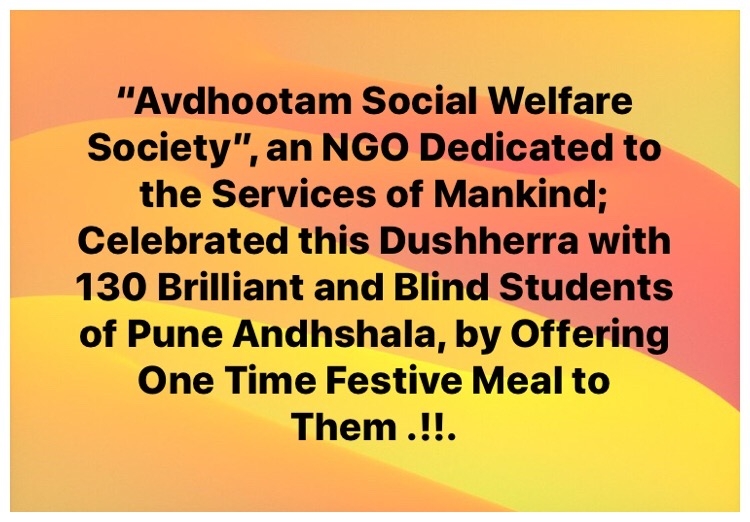 Avdhootam Social Welfare Society celebrated world sight day and Dusshera at Pune Andhshala. As we know October is Blindness Awareness Month. World Sight Day (WSD) is an annual day of awareness held on the second Thursday of October, to focus global attention on blindness and vision impairment. One time festive meal was offered to them and knowledge sharing of the digital world is done with intellectual students of Andhshala.